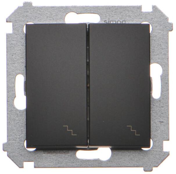 Dupla lépcsőházi kapcsoló (modul) 10AX 250V, gyorscsatlakozó, matt fekete színű Specifikáció: Sorozat: Simon 54 prémium Termék neve: Dupla lépcsőházi kapcsoló Színe: 1: Matt fekete Típus Maximális áram: 10 A Feszültség: 250 V AC A csatlakozók típusa IP-védelem: IP20 / IP44 Használjon DU kerettömítést az IP44 ellenállási osztály eléréséhez... Piktogram Anyagtípus: