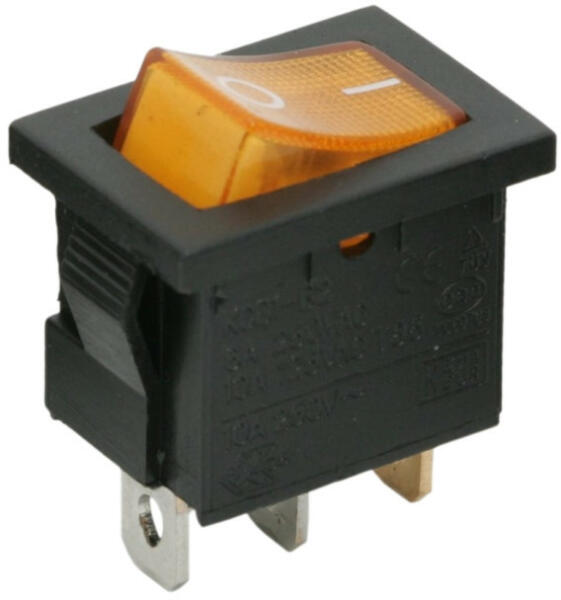 Billenő kapcsoló 1 áramkör 6A-250V OFF-ON sárga világítással Beépíthető billenőkapcsoló sárga színben, mely kiválóan használható gépekben, elektromos berenedezésekben. Felkapcsolt állapotban sárga világítással rendelkezik, így távolról is ellenőrizhető a bekapcsolt állapot. Műanyag házzal és 3 db 4,8 mm-es csatlakozólábbal rendelkezik. 1 áramkör 6 A - 250 V O
