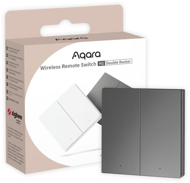 Aqara H1 Zigbee okos vezetéknélküli kapcsoló, távirányítóként tudja kapcsolni az Aqara fali kapcsolóit vagy más, a rendszerbe integráltan vezérelt áramköröket. Ez a szürke színű termékverzió. Aqara Vezetéknélküli H1 dupla kapcsoló lehetővé teszi, hogy Aqara H1 vezetékes falikapcsolóját vagy más áramköröket szabadon vezéreljen okos telefonjáról . Két áramkör