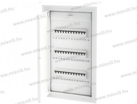 Téglafalba süllyeszthető teli műanyagajtós lakáselosztó - Modul szám: 36+6 - Mérete: 368 x 568 x 93 mm - Beépítési méret: 314 x 539 x 86,5 mm Műanyag ajtó és keret, fehér RAL 9016 Következő szabványoknak megfelel: EN 60670-1 i IEC 60670-24 Felszerelés: téglafalba Névleges áram: több mint 63A szigeteltség: 400V 2. osztály IP30 ajtó nélkül IP40 ajtóval Kiegészítő: D