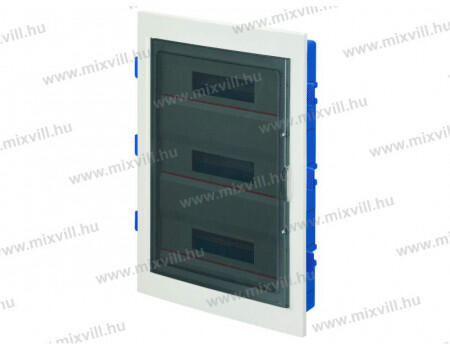 63554BE 54 modulos gipszkartonba sűllyeszthető lakáselosztó jellemzői: Méretek: 430x618x80mm 54 modulos kivitel Föld vagy nulla sínnel rendelkezik IP védettsége: IP40 Műszaki jellemzők: - A füst színű, polikarbonát ajtók nyitási iránya megfordítható. - A kék színű alj alapanyaga technopolimer, - Hőálló 850°C-ig, az IEC 60695-2-11 szabvány szerint végzett, izzítószá