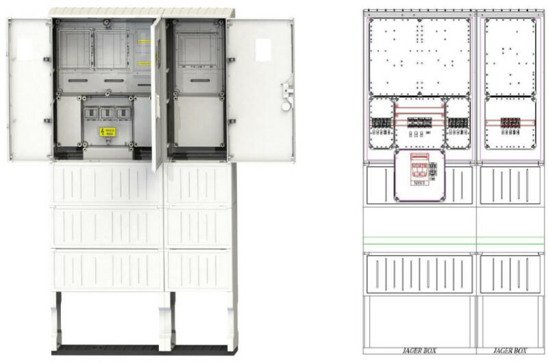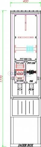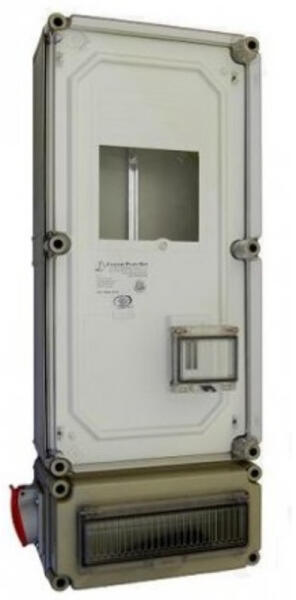 Háromfázisú fogyasztásmérőhöz, alsó elhelyezésű kismegszakító szekrénnyel, 1 db 12 modulos, csapófedeles ablakkal szerelve, maximum 12 db kismegszakító kezeléséhez, 1 db 288 mm hosszú, TS35, magasított kalapsínnel, PE és N sorkapcsokkal. A szekrényen 1 db 3P 16A/230V és 1 db 5P 16A/400V dugalj, 1 db 16A/1C, 1 db 16A/3C kismegszakító és 1 db 4P 40A 30mA Fi-relé találhat