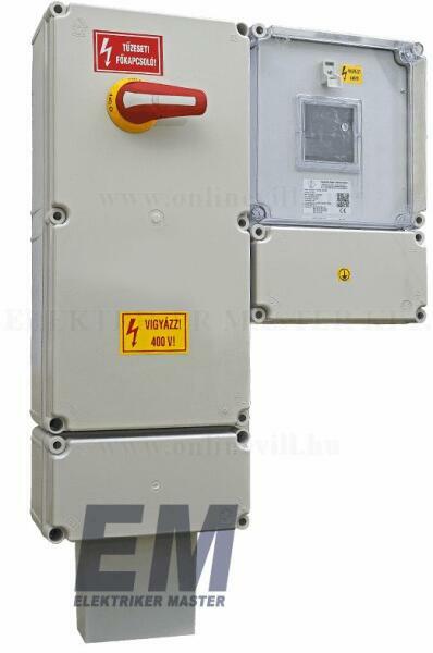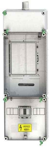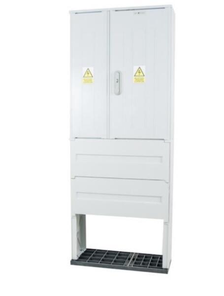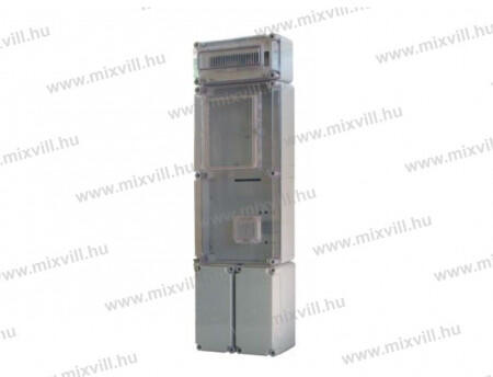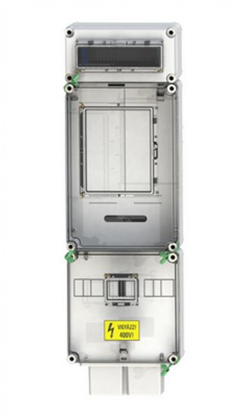 Méret: 300 x 1050 x 170 mm Háromfázisú fogyasztásmérőhöz 2 db alsó elhelyezésű, 150x300x170mm-es kábelfogadó szekrénnyel 1-1 db 138 mm hosszú, TS35 kalapsínnel Felső elhelyezésű kismegszakító szekrénnyel 1 db 12 modulos, csapófedeles ablakkal 1 db 288 m hosszú, TS 35, magasított kalapsínnel PE és N sorkapcsokkal 2 db PG36 furattal