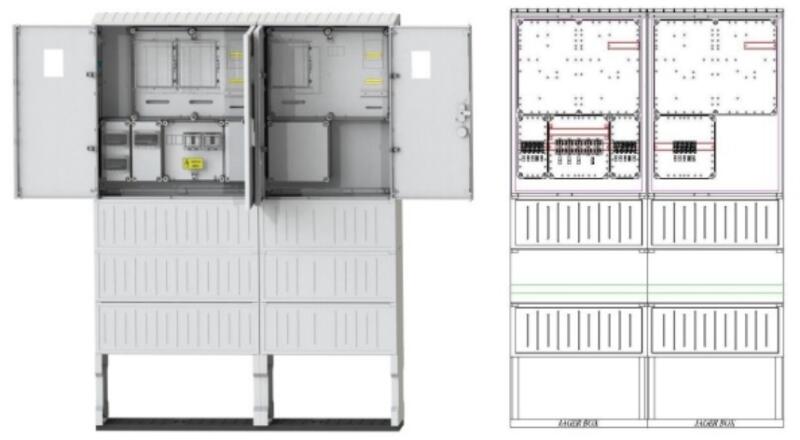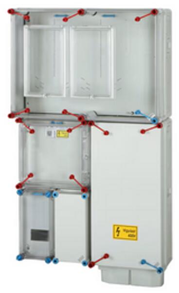 Méret: 300 x 750 x 170 mm Háromfázisú fogyasztásmérőhöz 2 db alsó elhelyezésű, 150 x 300 x 170 mm-es kábelfogadó szekrénnyel Az elmenő oldalon 2 db 138 mm hosszú, magasított TS35 kalapsínnel 2 db 6 modulos, csapófedeles ablakkal A szekrény oldalán 2 db 3P 16A/230V, 1 db 5P 16A/400V dugalj található A kábelfogadó oldal 1 db 138 mm hosszú, TS35 kalapsínnel szerelve 4 pólu