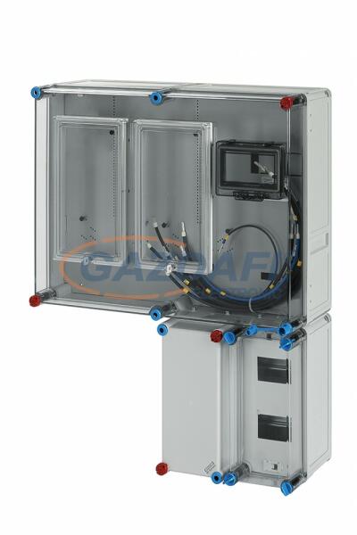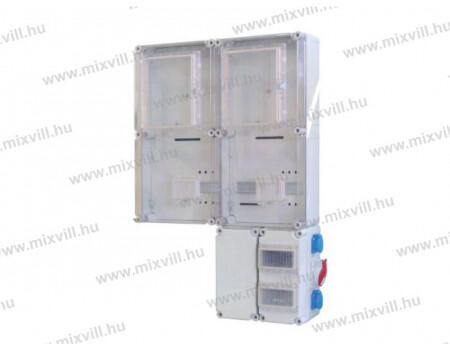 Méret: 600 x 900 x 170 mm Háromfázisú, két mérőhelyes, nappali és vezérelt fogyasztásméréshez, valamint hangfrekvenciás vezérlőkészülék számára kialakított szerelőlappal Az elmenő oldalon 2 db 138 mm hosszú, magasított TS35 kalapsínnel 2 db 6 modulos, csapófedeles ablakkal A szekrény oldalán 2 db 3P 16A/230V, 1 db 5P 16A/400V dugalj A kábelfogadó oldal 1 db 138 mm ho
