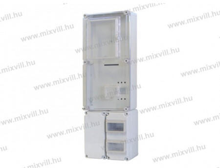 Méret: 300 x 450 x 170 mm Egyfázisú fogyasztásmérőhöz felső elhelyezésű kismegszakító szekrénnyel 1 db 12 modulos, csapófedeles ablakkal Maximum 12 db kismegszakító kezeléséhez 1 db 288 mm hosszú, TS35, magasított kalapsínnel PE és N sorkapoccsal A szekrényen 2 db 3P 16A/230V dugalj található 2 db 1P C16A kismegszakító 1 db 2P 40A 30mA Fi-relé Kompletten vezetékezve