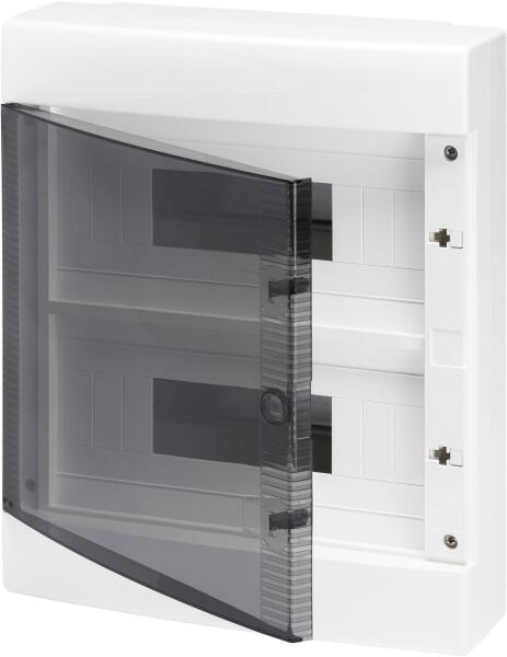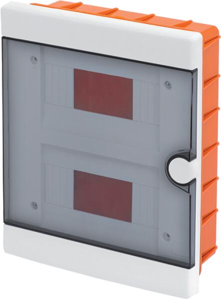 Lakáselosztó (kiselosztó) dobozok falba beépíthető 16 modulhoz. Sorok száma: 2 A kiselosztó dobozok új építésű vagy renoválandó épületekben kerülnek felszerelésre. Olyan moduláris kivitelű doboz, amelyben a lakásban kiépített áramkörök védelmére szolgáló készülékek működnek. Minden sor felfelé 90°-ra nyíló átlátszó ajtóval rendelkezik. Anyaga fehér, nem