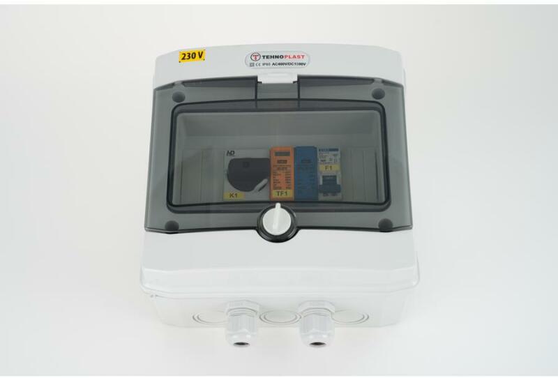 SOLAR doboz, szerelt, AC 1 fázis védelemmel, 1500V DC, IP65, 200x200x120 mm, átlátszó ajtó (SD-AC1F-32A-T2T3) Termékinformáció: Anyaga: ABS Méret: 200 x 200 x 120 mm Modulok száma: 8 db Névleges feszültség: 1500V DC IP védettség: IP65 IMO túlfeszültség levezető SPD2-401N Kismegszakító 6kA, C karakterisztika, 1P, 32A Moduláris teherkapcsoló, 3x16A, 0-1 állás, közvetlen ka