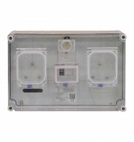 SOLAR doboz, szerelt, AC 3 fázisú védelemmel, 1500V DC, IP65, 318x258x142 m, átlátszó ajtóval (SD-AC3F-32A-T2T3) Termékinformáció: Anyaga: ABS Méret: 318 x 258 x 142 mm Névleges feszültség: 1500V DC Modulok száma: 12 db IP védettség: IP65 IMO túlfeszültség levezető SPD4-403N Kismegszakító 6kA, C karakterisztika, 3P, 32A Moduláris teherkapcsoló, 3x32A, 0-1 állás, közvetl