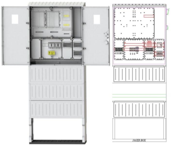 Méret: 300 x 600 x 170 mm Háromfázisú fogyasztásmérőhöz Felső elhelyezésű kismegszakító szekrénnyel 1 db 12 modulos, csapófedeles ablakkal Maximum 12 db kismegszakító kezeléséhez 1 db 288 mm hosszú, TS35, magasított kalapsínnel PE és N sorkapoccsal A szekrényen 1 db 3P 16A/230V, 1 db 5P 16A/400V dugalj található 1 db 1P C16A és 1 db 3P C16A kismegszakítóval 1 db 4P 40A