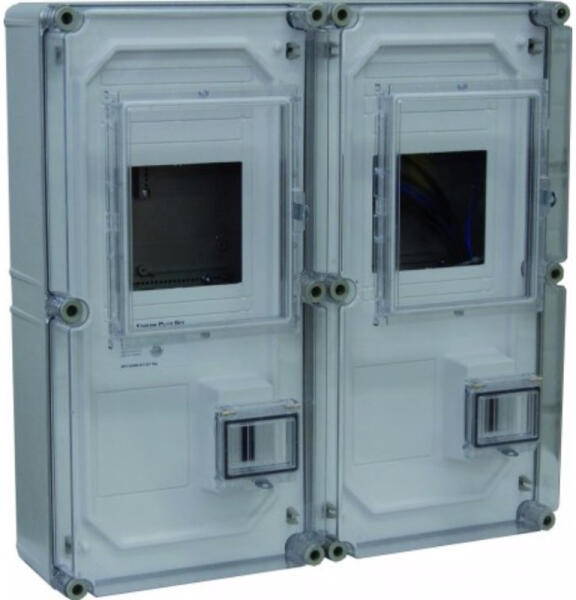 Előrefizetős (kártyás) háromfázisú kombinált fogyasztásmérőhöz, beépített mérőkereszttel és mérőfelerősítő csavarokkal, digitális mérőablakkal a mérő-, és kismegszakító kezeléshez. Fogyasztásmérő szekrény 2x1-3F + vezérlő előre fizetős méret: 600x600x170mm cikkszáma PVT 6060 Á-V EF Fm