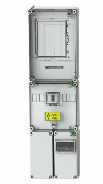Kábelbevezetés 2 oldalról Egyfázisú fogyasztásmérőhöz Beépíth ető mérőkereszttel és fogyasztásmérő felerősítő csavarokkal, az MSZ 447.98 szerint Fedélzárás szerszámmal Kettős (külső és belső) plombálási lehetőséggel Csapófedéllel a védelmi készülékek kezeléséhez Mellékelt tartozék: automatadobozzal, 1 soros, 12 osztásegység (12x18 mm), levehető fedél