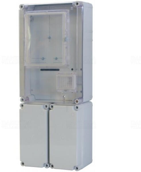Méret: 600 x 750 x 170 mm Háromfázisú, két mérőhelyes, nappali és vezérelt fogyasztásméréshez, valamint hangfrekvenciás vezérlőkészülék számára kialakított szerelőlappal 2 db felső elhelyezésű kismegszakító szekrénnyel 2 db 12 modulos csapófedeles ablakkal 2 db 288 mm hosszú, TS35, magasított kalapsínnel PE és N sorkapcsokkal