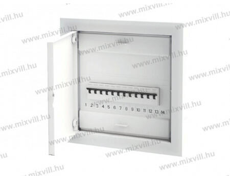 Téglafalba süllyeszthető teli műanyag ajtós lakáselosztó- Modul szám: 12+2 - Mérete: 368 x 343 x 93 mm - Beépítési méret: 314 x 314 x 86,5 mm Műanyag ajtó és keret, fehér RAL 9016 Következő szabványoknak megfelel: EN 60670-1 i IEC 60670-24 Felszerelés: téglafalba Névleges áram: több mint 63A szigeteltség: 400V 2. osztály IP30 ajtó nélkül IP40 ajtóval Kiegészítő: D