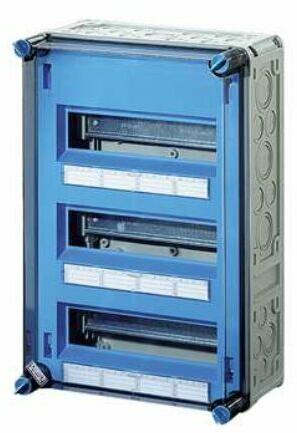 DIN 43 880 szerinti sorolható készülékek beépítéséhez PE- és N kapcsok nélkül Takarósávokkala és feliratsávokkal a készüléknyílásokhoz kézi fedélzárók membrános zárólappal és földelés csatlakozóval: osztásegység: 36 3 x 12 x 18 mm tartósínek: 3 soros Védettség: IP 65 érintésvédelmi osztály: II Alapanyag: termoplaszt Színárnyalat: szürke RAL 7032 mére