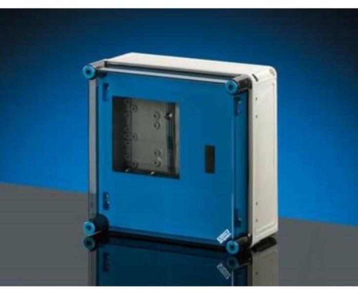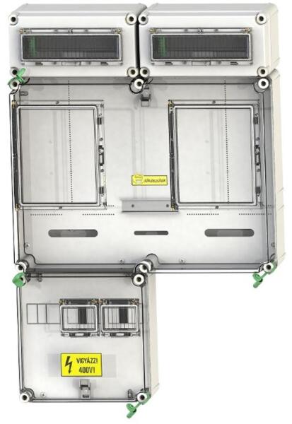 Háromfázisú fogyasztásmérőhöz Alsó elhelyezésű, 300x300x170mm-es kábelfogadó szekrénnyel 290x290x4mm műanyag szerelőlappal Felső elhelyezésű kismegszakító szekrénnyel 1 db 12 modulos, csapófedeles ablakkal 1 db 288 mm hosszú, TS 35, magasított kalapsínnel PE és N sorkapcsokkal