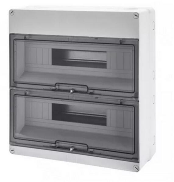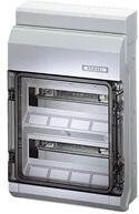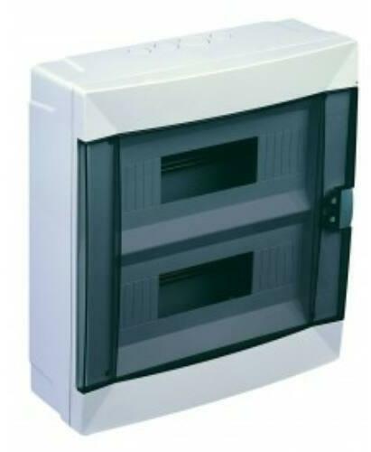 Felületre szerelhető biztosító tábla, 24db 17,5mm-es moduláris eszköz részére. Tartalmaz: 35mm-es szabványos TS sínt, az eszközök rögzítésére, füstszínű ajtót, PE N síneket Méretek:386 mm x 328 mm x 108 mm ( magasság x szélesség x mélység ) Megfelel az IEC61439-3 szabványnak. II. érintésvédelmi osztály 650°C-ig önkioltó műanyag falon kívüli doboz
