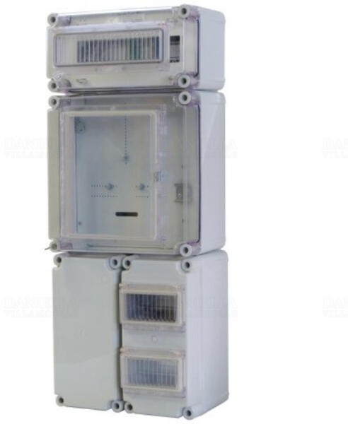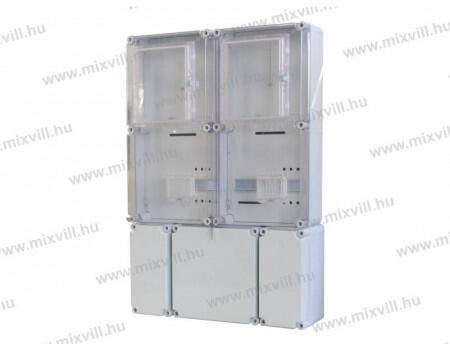 Háromfázisú, két mérőhelyes, nappali és vezérelt fogyasztásméréshez, valamint hangfrekvenciás vezérlőkészülék számára kialakított szerelőlappal 3 db földkábeles csatlakoztatásra alkalmas kábelfogadó tokozat 2 db 150 x 300 x 170 mm-es tokozatban 138 mm hosszú TS35 kalapsín 1 db 300 x 300 x 170 mm-es tokozatban 288 mm hosszú TS35 kalapsín 3 db PG36 furat