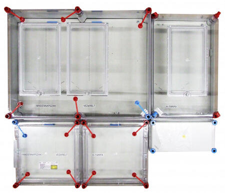 Műszaki jellemzők: - Névleges feszültség: 1000 V-ig - Maximális áramerősség: 1250 A-ig - Méretek: = Magasság: 250 mm-től 1800 mm-ig = Szélesség: 250 mm-től 10000 mm -ig = Mélység: 150 mm/ 200 mm /250 mm Rögzítési lemez / 30 a berendezéshez - A bemeneti-kimeneti vezetékek burkolata - Földelő dübelcsap - Anyaga: Acél - IP kód: IP65 Előnyök: - Lehetőség a nyitási irán