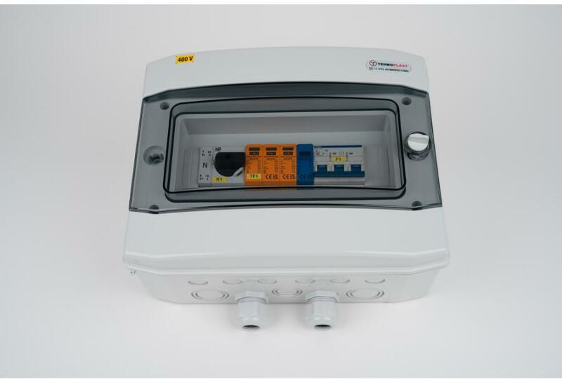 SOLAR doboz, szerelt, AC 3 fázisú védelemmel, 1500V DC, IP65, 318x258x142 m, átlátszó ajtóval (SD-AC3F-20A-T2T3) Termékinformáció: Anyaga: ABS Méret: 318 x 258 x 142 mm Névleges feszültség: 1500V DC Modulok száma: 12 db IP védettség: IP65 IMO túlfeszültség levezető SPD4-403N Kismegszakító 6kA, C karakterisztika, 3P, 20A Moduláris teherkapcsoló, 3x32A, 0-1 állás, közvetl