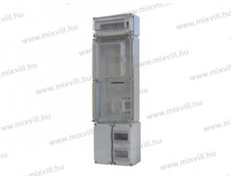Méret: 300 x 1050 x 750 mm Háromfázisú fogyasztásmérőhöz 2 db alsó elhelyezésű, 150x300x170mm-es kábelfogadó szekrénnyel Az elmenő oldalon 2 db 138 mm hosszú, magasított TS35 kalapsínnel 2 db 6 modulos, csapófedeles ablakkal Kábelfogadó oldalon 1 db 138 mm hosszú, TS35 kalapsínnel Felső elhelyezésű kismegszakító szekrénnyel 1 db 12 modulos , csapófedeles ablakkal 1 db