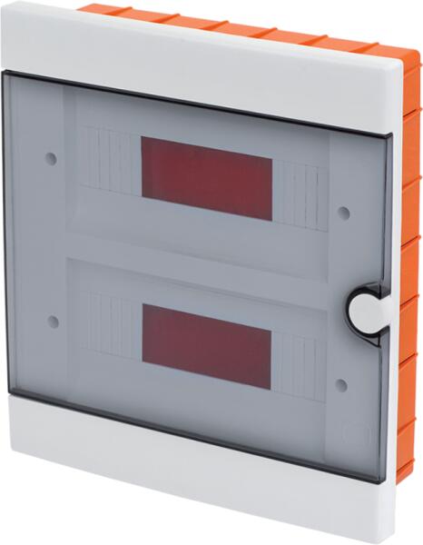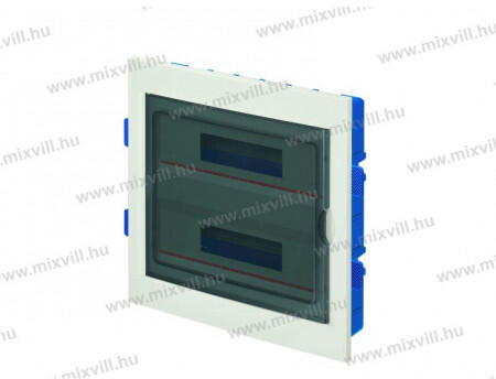 Lakáselosztó (kiselosztó) dobozok falba beépíthető 24 modulhoz. Sorok száma: 2 A kiselosztó dobozok új építésű vagy renoválandó épületekben kerülnek felszerelésre. Olyan moduláris kivitelű doboz, amelyben a lakásban kiépített áramkörök védelmére szolgáló készülékek működnek. Minden sor felfelé 90°-ra nyíló átlátszó ajtóval rendelkezik. Anyaga fehér, nem