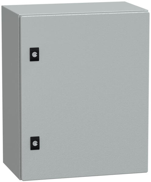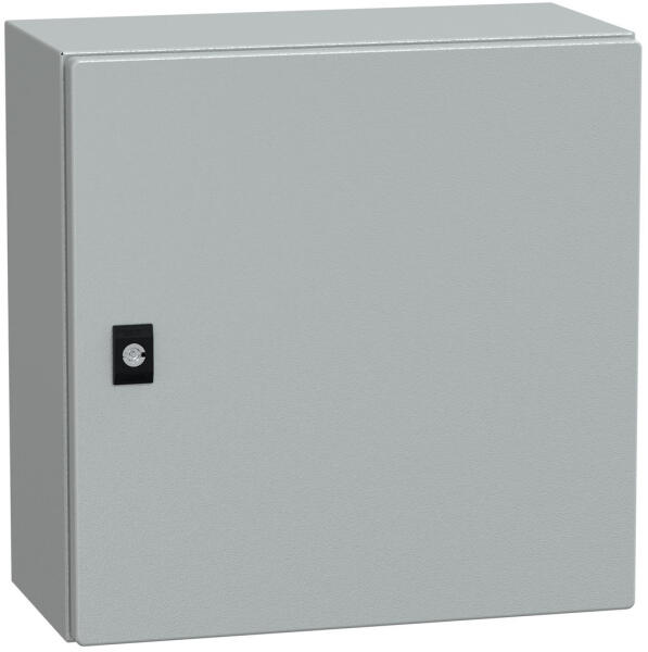 Méretek: - magasság (H): 600 mm - szélesség: (W): 500 mm - mélység (D): 150 mm Egy ajtós Szigetelési feszültség: 1000V Névleges áram: 630A Lemezvastagság 1,2 mm IP védettség: IP66 A szekrények tartalmazzák a horganyzott szerelőlapot és a kábelbevezető lemezt Az ajtónyitási irány megváltoztatható Elektrosztatikus úton festett Szín RAL-7035 Galvanizált szerelőlap