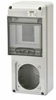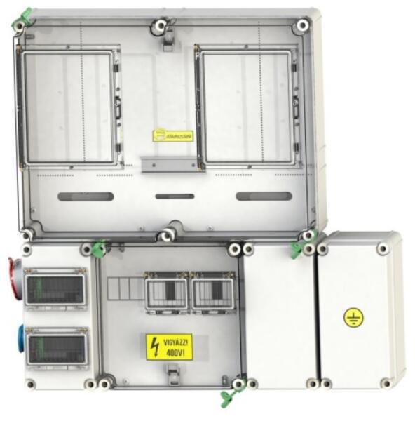 Csatári Plast PVT3060 FO 3030-F12ÁK háromfázisú fogyasztásmérő tokozat átlátszó fedéllel 1 db felső elhelyezésű, 150 x 300 x 170 mm méretű kismegszakító tokozattal 1 db 12 modulos csapófedeles ablakkal 1 db 288 mm hosszú TS35 sínnel 1 db alsó elhelyezésű, 300 x 300 x 170 mm méretű kábelfogadó tokozattal 290 x 290 x 4 mm méretű műanyag szerelőlappal PE és N sorkapc