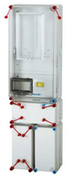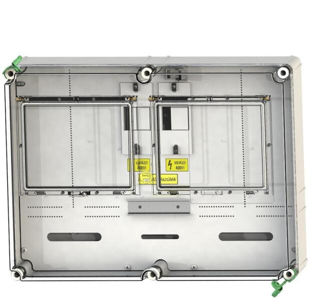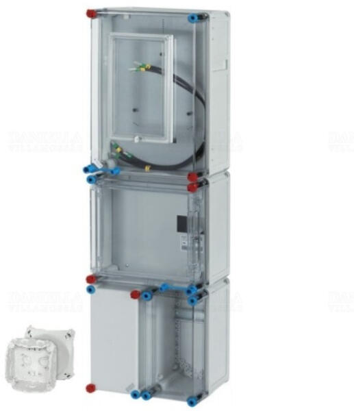 Méret: 300 x 450 x 170 mm Egyfázisú fogyasztásmérőhöz Alsó elhelyezésű kismegszakító szekrénnyel 1 db 12 modulos, csapófedeles ablakkal Maximum 12 db kismegszakító kezeléséhez 1 db 288 mm hosszú, TS35, magasított kalapsínnel PE és N sorkapoccsal A szekrényen 2 db 3P 16A/230V dugalj található 2 db 1P C16A kismegszakító 1 db 2P 40A 30mA Fi-relé Kompletten vezetékezve