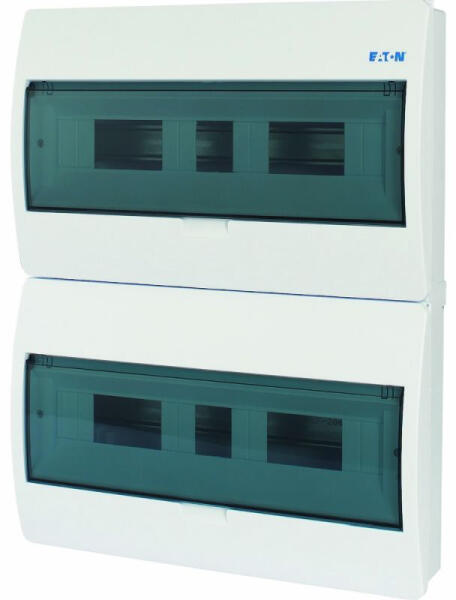 Leírás: E ASY9 EU Kiselosztó, 18 modul, PE+N sínnel, füstszínű ajtóval, süllyesztett Környezet: Szabványok: IEC 60670-1-24 IP védettségi szint: IP40 megfelel MSZ EN 60529 (zárt állapot), IP30 megfelel MSZ EN 60529 (nyíltan szerelt) IK védettségi fok: IK07, amely megfelel az IEC 62262 szabványnak Szennyezettségi fok: 2 Tűzellenállási képesség: 650 °C ( 30 s ) megfelel az I