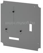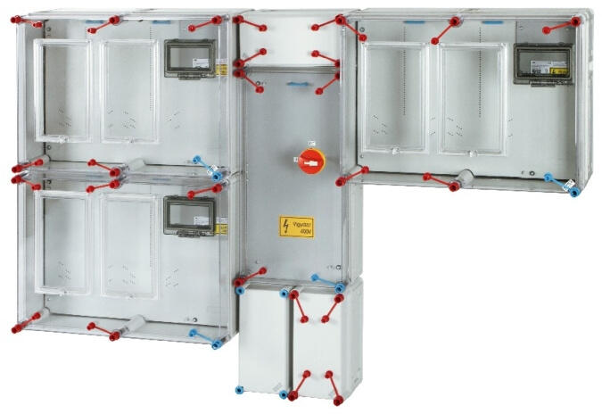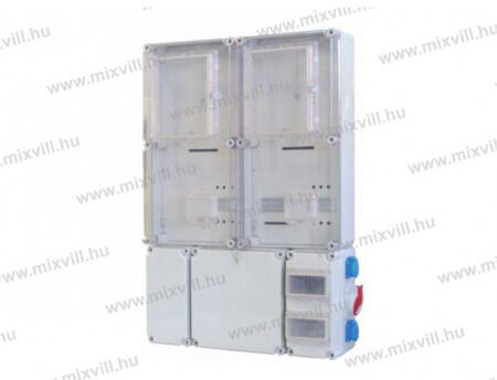 Háromfázisú, két mérőhelyes, nappali és vezérelt fogyasztásméréshez, valamint hangfrekvenciás vezérlőkészülék számára kialakított szerelőlappal Elmenő oldalon 2 db 138 mm hosszú, magasított, TS35 kalapsínnel 2 db 6 modulos csapófedeles ablakkal A szekrényen 2 db 3P 16A/230V dugalj és 1 db 5P 16A/400V dugalj található A kábelfogadó oldalon 1 db 288 mm hosszú, TS35 k