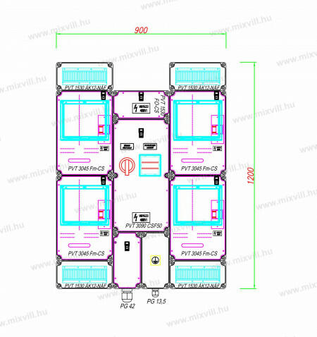 PVTCS 2-4 4 lakásos direkt csoportos mérőhely, elmenő oldalon 1530 12ÁK felületre szerelhető CSP21. tT001 Két-négy felhasználási helyes M63A csoportos mérés rendszer, felületre szerelt kivitelben, túlfeszültség levezetővel, tűzeseti leválasztóval Felépít se: - PVT 1530 ÁK12-NÁF 4db - PVT 1530 FO-CS 1db - PVT 3045 Fm-CS 4db - PVT 3090 CSF50 1db Mérete: 900x1200x230mm
