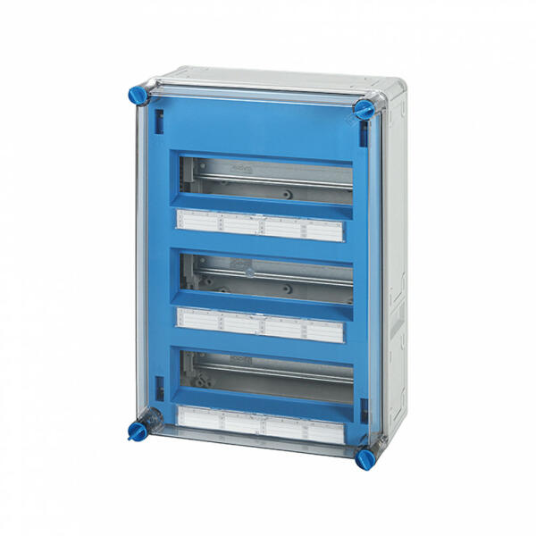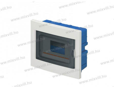 63508BE 8 modulos gipszkartonba sűllyeszthető lakáselosztó jellemzői: Méretek: 240x194x80mm 8 modulos kivitel Föld vagy nulla sínnel rendelkezik IP védettsége: IP40 Műszaki jellemzők: - A füst színű, polikarbonát ajtók nyitási iránya megfordítható. - A kék színű alj alapanyaga technopolimer, - Hőálló 850°C-ig, az IEC 60695-2-11 szabvány szerint végzett, izzítószála