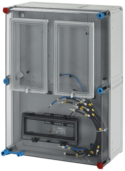 HENSEL Basic HB33K0 Fogyasztásmérő szekrény, villanyóraszekrény 2db 1 vagy 3 fázisú mérő + vevő Méret: 600x450x185 mm Hangfrekvenciás vevő (ELMŰ, ÉMÁSZ) vagy EK 593 rádiófrekvenciás vevő (E. ON)számára, 2x3, vagy 2x1 fázisú alkalmazásra, Fővezetéki sorkapocs nélkül 1 soros, 12 osztásegység (12x18 mm) N- és PE kapcsok nélkül Beltéri és kültéri alkalmazásra 63