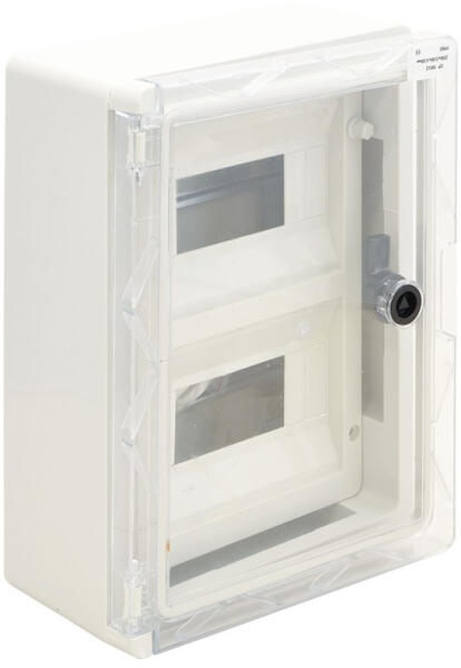 Tracon maszkos műanyag elosztószekrény, átlátszó ajtóval, 330×250×130mm 2x9 modullal IP65, TRACON TME332513MT Tracon maszkos műanyag elosztószekrények, komoly IP védettséggel rendelkeznek, (IP55, IP65, ), így alkalmasak bel- és kültéri moduláris szerelésre , és elhelyezésre egyaránt. A Tracon maszkos műanyag elosztószekrények elosztószekrényeket az iparban, a háztartá
