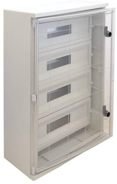 Tracon maszkos műanyag elosztószekrény, átlátszó ajtóval, 700×500×245mm 4x22 modullal IP65, TRACON TME705025MT Tracon maszkos műanyag elosztószekrények, komoly IP védettséggel rendelkeznek, (IP55, IP65, ), így alkalmasak bel- és kültéri moduláris szerelésre , és elhelyezésre egyaránt. A Tracon maszkos műanyag elosztószekrények elosztószekrényeket az iparban, a háztart