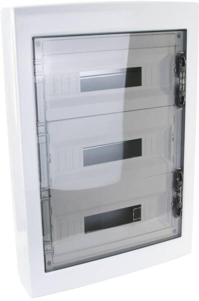 Tracon EDFKS-18/3 Műanyag kiselosztó, 54 modul, 3 sor, füstszínű sík ajtóval, IP40, falon kívüli Szerelési mód: falon kívüli Sorok száma: 3 Modulszélesség: 18 Fedél/burkolat fajtája: fedél Átlátszó fedél/ajtó: Igen Ház anyaga: műanyag Magasság: 670 mm Szélesség: 464 mm Mélység: 120 mm Földelő sorkapocs: Nem Nullavezető sorkapocs: Nem DIN-sín: Igen Szín: fehér V