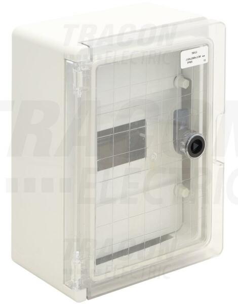 Tracon maszkos műanyag elosztószekrény, átlátszó ajtóval, 280×210×130mm 1x8 modullal IP65, TRACON TME282113MT Tracon maszkos műanyag elosztószekrények, komoly IP védettséggel rendelkeznek, (IP55, IP65, ), így alkalmasak bel- és kültéri moduláris szerelésre , és elhelyezésre egyaránt. A Tracon maszkos műanyag elosztószekrények elosztószekrényeket az iparban, a háztartá