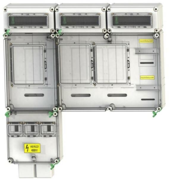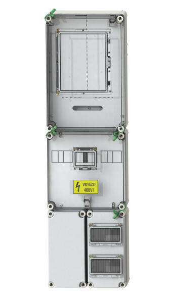 Méret: 300 x 600 x 170 mm Háromfázisú fogyasztásmérőhöz Alsó elhelyezésű kismegszakító szekrénnyel 1 db 12 modulos, csapófedeles ablakkal Maximum 12 db kismegszakító kezeléséhez 1 db 288 mm hosszú, TS35, magasított kalapsínnel PE és N sorkapoccsal