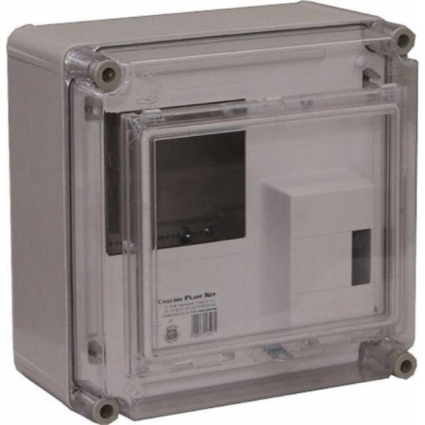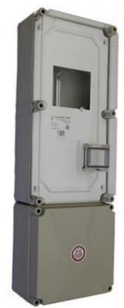 Mérőhely egyfázisú kártyás* fogyasztásmérőhözBeépítet t mérõkereszt és mérőfelerősítő csavarokkal, digitális mérőablakkal a mérő, valamint a kismegszakító kezeléséhez. Méret:300x300x170mm. Védettség IP65. Szín: szürke(RAL7032) * Lényege: a fogyasztó befizet egy összeget, kap egy 20 számból álló kódot, azt beüti a villanyórába, megkezdõdik a szolgáltat