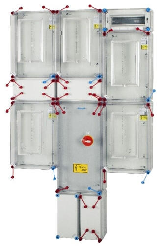 Műszaki jellemzők: - Névleges feszültség: 1000 V-ig - Maximális áramerősség: 1250 A-ig - Méretek: = Magasság: 250 mm-től 1800 mm-ig = Szélesség: 250 mm-től 10000 mm -ig = Mélység: 150 mm/ 200 mm /250 mm Rögzítési lemez / 30 a berendezéshez - A bemeneti-kimeneti vezetékek burkolata - Földelő dübelcsap - Anyaga: Acél - IP kód: IP65 Előnyök: - Lehetőség a nyitási irán