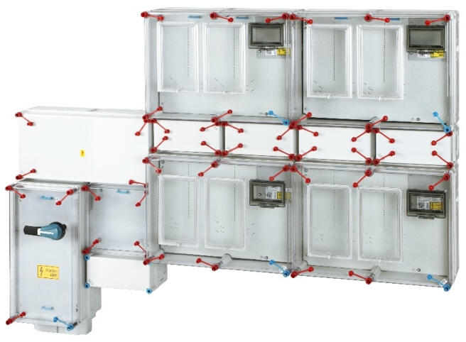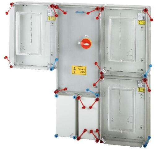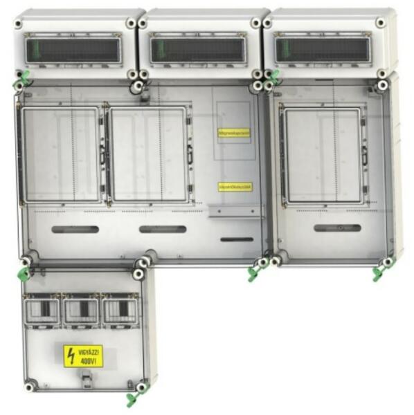 HCS431 Csoportos mérőhely, három fogyasztó részére mindennapszaki mérésre 63 A-ig, kapcsolóval és NH 00 szakaszolható biztosítóaljzattal túlfeszültség levezetőhöz előkészítve, - Műanyag szerelőlemezzel - Fedélzárás szerszámmal - Kizárólagos őrizet alá vonásra előkészítve - Kikönnyítés nélküli megerősített oldalfalakkal, ékes-csapos összeépítéshez - Be