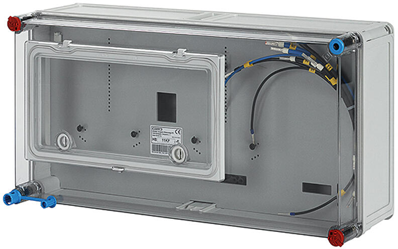 HENSEL Basic HB11KF Fogyasztásmérő szekrény 2db 1 fázisú mérő vízszintes + vevő Méret: 600x300x185 mm Hangfrekvenciás vevő (ELMŰ, ÉMÁSZ) vagy EK 593 rádiófrekvenciás vevő (E. ON) számára, Fővezetéki sorkapocs nélkül Fekvő kivitel 1 soros, 12 osztásegység (12x18 mm) N- és PE kapcsok nélkül Beltéri és kültéri alkalmazásra 63 A-ig. Beépített mérőkereszttelés