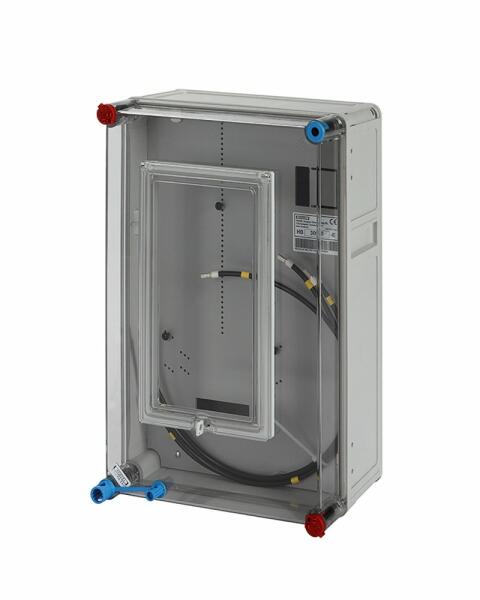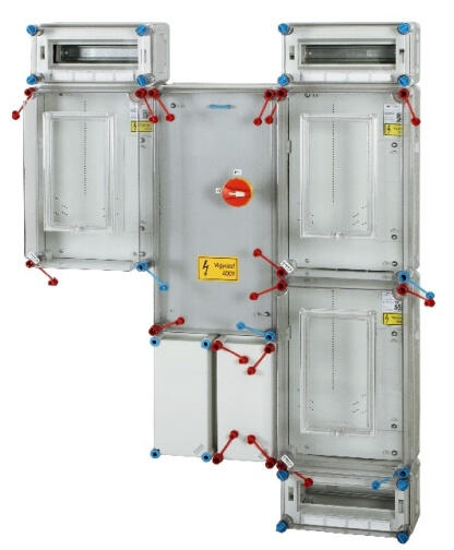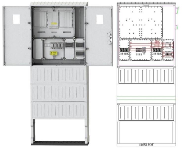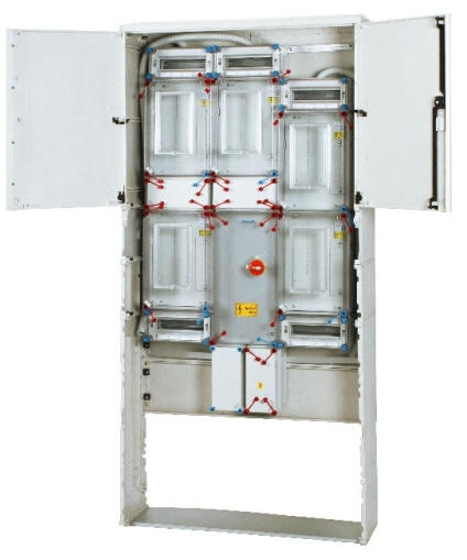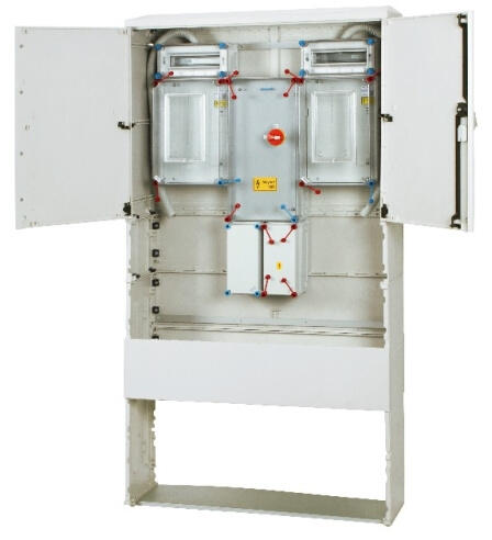 HCS421+MFE Csoportos mérőhely, két fogyasztó részére mindennapszaki mérésre 63 A-ig, kapcsolóval és NH 00 szakaszolható biztosítóaljzattal - Túlfeszültség levezetőhöz előkészítve, - Fogyasztói főelosztóval, kültéri alkalmazásra - Műanyag szerelőlemezzel - Fedélzárás szerszámmal - Kizárólagos őrizet alá vonásra előkészítve - Kikönnyítés nélküli megerős