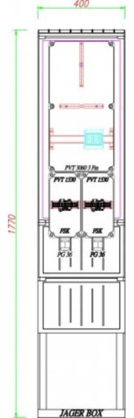PVT-K-L Á-V Fm-Fi CSP21. ES056 ( PVT-K-L Á-V Fm-Fi)-K-M63.80A-V32A / + Egy felhasználási helyes M63.80A és V32A mérés földkábeles, szabadon álló szerelt kivitelben, - fogyasztói főelosztóval, - áramvédős kismegszakítóval, - túlfeszültség levezetővel - 1 db 5p 16A és - 2db 3P 16A/230V dugaljjal