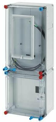 Egyfázisú fogyasztásmérőhöz 2 db alsó elhelyezésű 150 x 300 x 170 mm-es kábelfogadó tokozattal 1-1 db 138 mm hosszú TS35 kalapsínnel PG 36 furattal