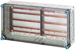 Gyűjtősínes szekrény Diazed, Neozed ill. NH biztosítós szekrényekkel történő kombinációhoz N-vezetők megnövelt áramvezető képességgel Fedélzárás szerszámmal Gyűjtősín névleges áramerőssége 400 A Gyűjtősínek pólusszáma 5 pólusú Vezetékanyag: Cu Vezetékkapcsok nélkül Védettség: IP 65 érintésvédelmi osztály: II Színárnyalat: szürke RAL 7032 Alapanyag: