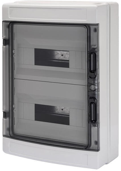 GEWISS ELOSZTÓSZEKR. 24M FALON KÍVÜLI FÜST AJTÓ IP65 (GW40104) Termék információ: Érin tésvédelmi osztály: II (IEC 61140 szabvány szerint) Szín: Szürke RAL 7035 Külső méretek HxMxM (mm): 298x420x140 IP védettség: IP65 Kimenő teljesítmény: 26 Ütés állóság: IK09 Névleges feszültség: 400 V Modulok száma EN 50022 szabvány szerinti modulok esetén: 24 Modulok száma EN
