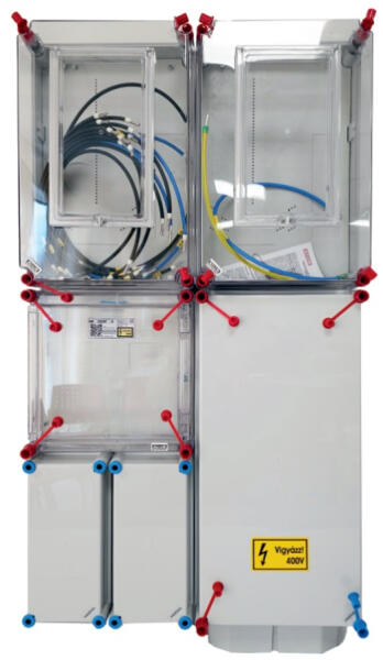 HENSEL HB33KHF-U 1 és 3 fázisú 2 mérőhelyes fogyasztásmérő szekrény egyedi mindennapszaki (80 A-ig) és H-tarifás (63 A-ig) méréshez (1091017) HB33KHF-U két mérőhelyes fogyasztásmérő szekrény földkábeles méretlen oldali és földkábeles, vagy szabadvezetékes mért oldali csatlakozással, mindennapszaki és H-tarifás méréshez. A kialakítás mindennapszaki mérésre 80 A-