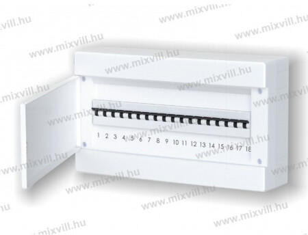 A modulos lakáselosztók zárhatóak is. IDE kattintva rendelhet, RB-13 kulcsos zárat. Termék jellemzők: Tágasabb belső hely, mint a hasonló termékeknél. Megfelel a 960°-os izzószálastesztnek Class II Környezeti hőmérséklet: -15°C ... + 60°C RAL9016 Névleges áramerősség: 63A- Modulszám: 18 - Mérete: szélesség: 389 mm x magasság: 225 mm x mélység: 97 mm - Megfordíthat